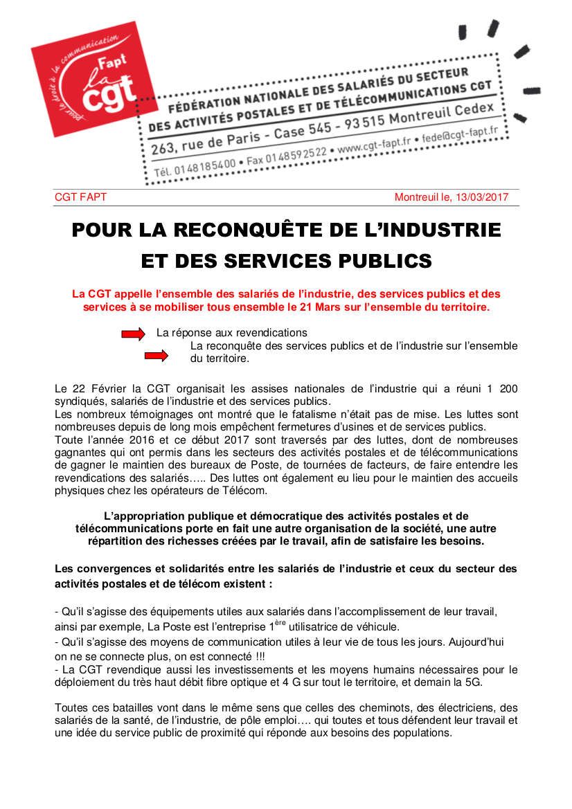 21 MARS, CONVERGENCE des luttes : les salariés des postes et des télécommunications également dans la l'action !